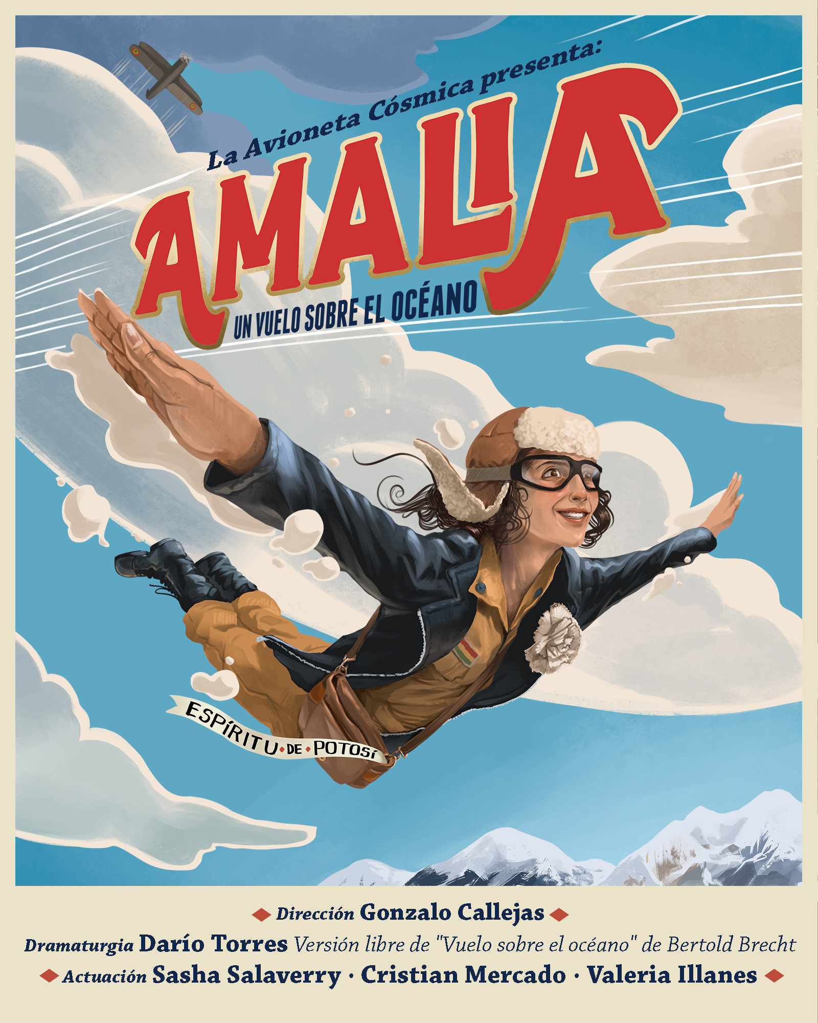 "Amalia, un vuelo sobre el océano" es una versión libre de la pieza radiofónica infantil de Bertold Brecht escrita por Darío Torres. Relata el vuelo más importante de Amalia Villa De la Tapia, la primera piloto boliviana. En esta aventura, Amalia deberá desafiar no solo las dificultades naturales como la niebla, el sueño, el frío y las tormentas de nieve, sino también los desafíos de su época y su sociedad.